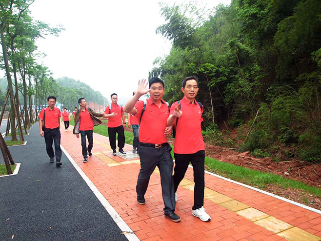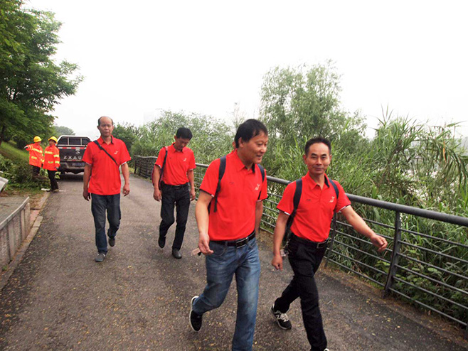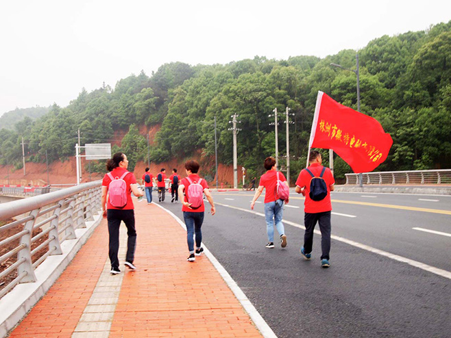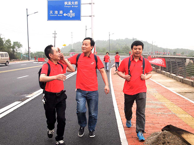 早晨8點(diǎn),全體員工精神飽滿的到達(dá)集合點(diǎn)。總經(jīng)辦蘇哲高舉旗幟,闊步向前帶領(lǐng)全員從鋼琴廣場(chǎng)出發(fā),沿濱江南路一路向南過楓溪大橋,下橋后沿盛世路向北,改走河?xùn)|風(fēng)光帶。一路湘水清清、草木蒼翠,漫步其中倍感舒適與恬靜,大家穿著印有公司LOGO的紅色文化衫也成為綠色風(fēng)光帶上的一道與自然和諧共處的亮麗風(fēng)景線。