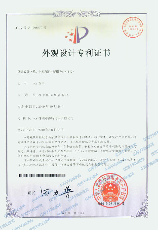 機(jī)電配件(碳刷W01-1112)--2010年外觀設(shè)計專利證書