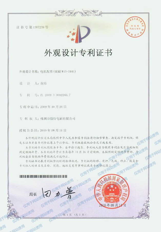 機(jī)電配件(碳刷W15-3441)--2010年外觀設(shè)計(jì)專利證書002