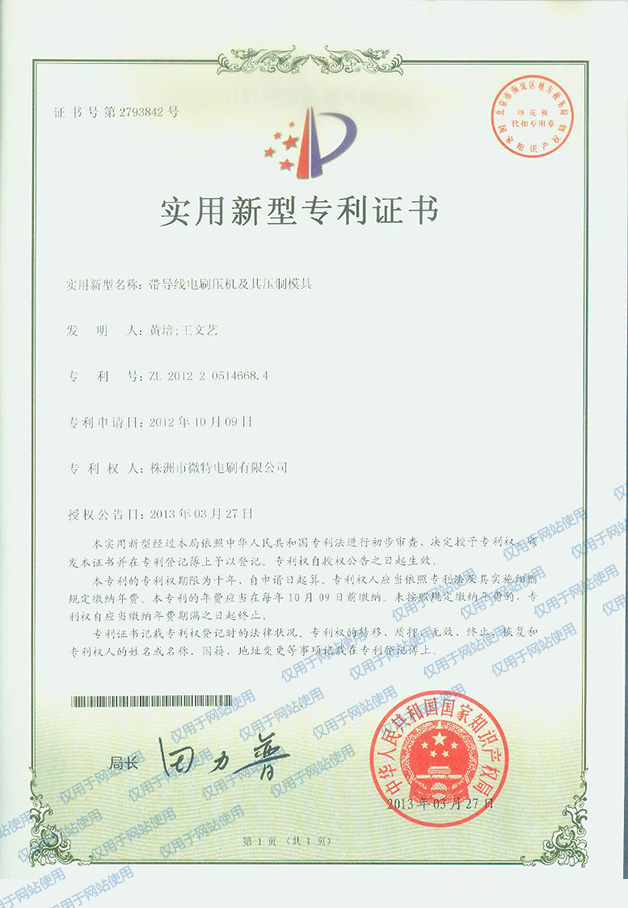 帶導(dǎo)線電刷壓機(jī)及其壓制模具--2013年專利證書002
